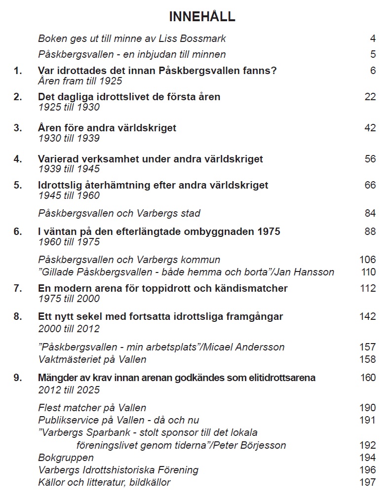 Den ger en kärleksfull och detaljerad tillbakablick på ett sekel av idrottshistoria centrerad kring den fi na idrottsplatsen Påskbergsvallen i Varberg. Genom rikt bildmaterial och berättelser skildras dess utveckling från sin tillkomst till dagens moderna anläggning. Läsaren får följa minnesvärda ögonblick, legendariska spelare och de lokala föreningarnas framgångar och motgångar, som har präglat Påskbergsvallen genom åren.